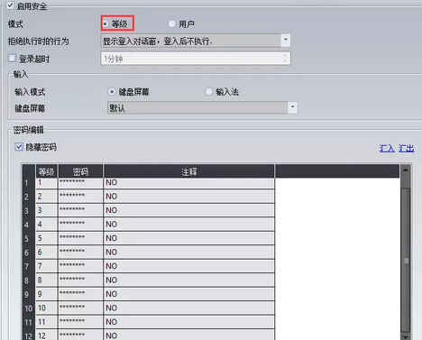 部分企業的產線人員流動性較大,這使得管理層對于設備的操作密碼也就是觸摸屏的安全等級信息、密碼的管理造成了一定程度上的麻煩,每次出現人員變動就叫系統廠商來重新處理程序是比較麻煩的,最方便的方法就是讓產線管理人員自己修改安全等級信息、密碼,這也就涉及到了C3人機界面的安全等級密碼在線更新的功能。深圳捷達興,永宏一級代理,