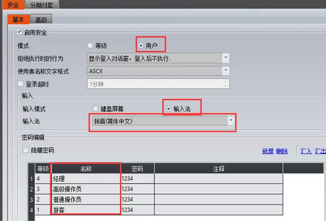 安全里面有兩種模式:第一種是等級模式對于賬戶信息,您只可以修改密碼;第二種是用戶模式,處理等級密碼之外,您還可以設定用戶名。如下圖: